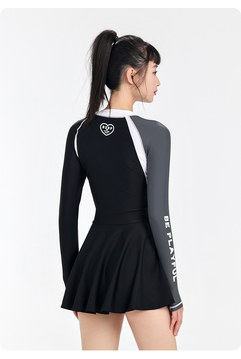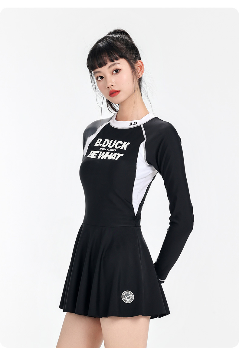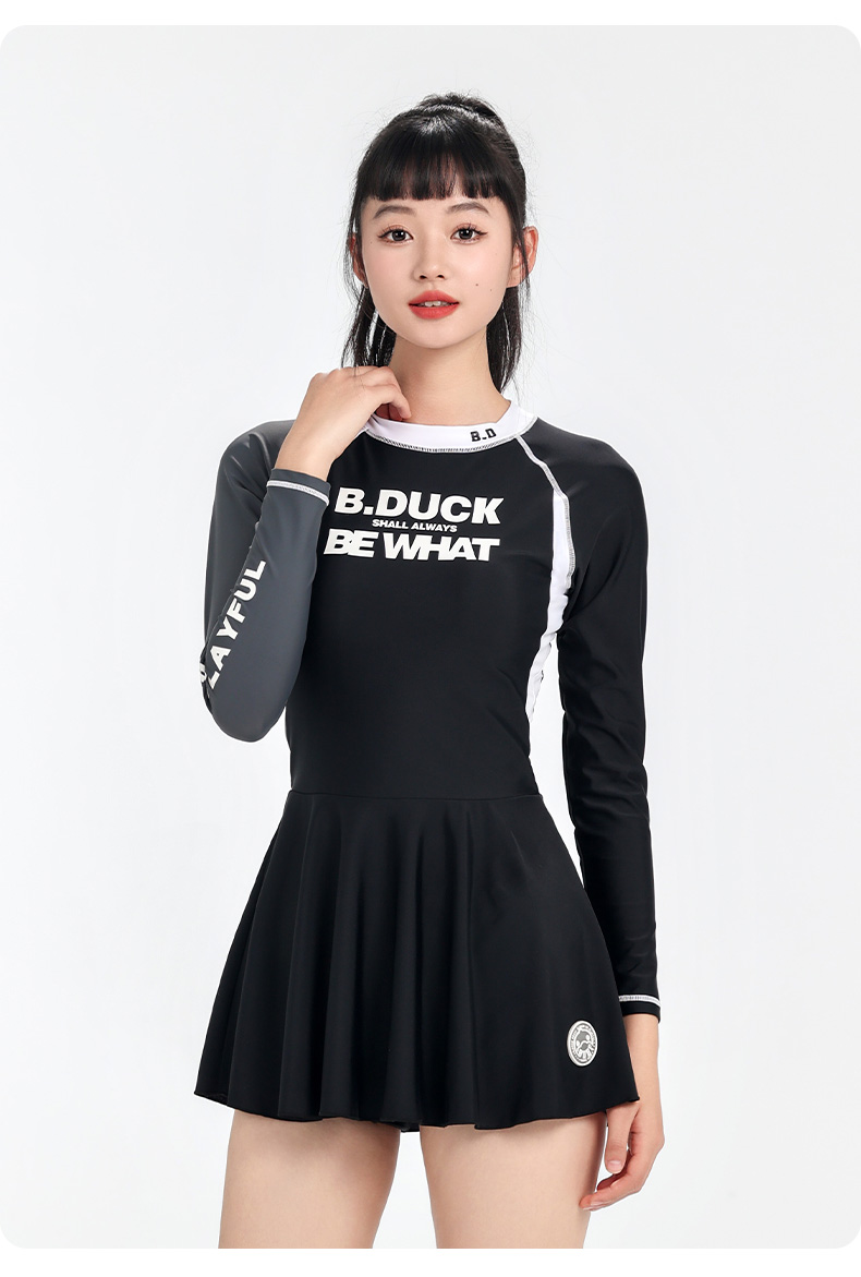 B.Duck Women's One-Piece Swim Dress: Slimming Long-Sleeve Rash Guard with Skirt Modesty Panel | Plus-Size UV Protection for Swimming & Water Sports